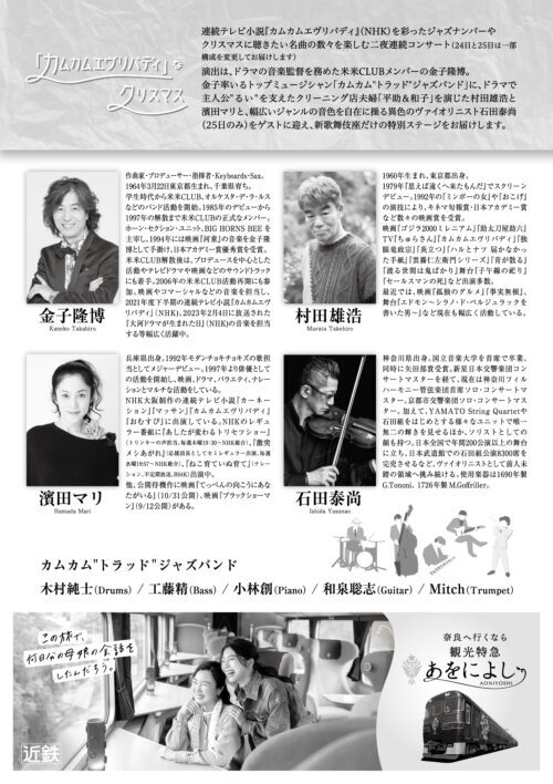 連続テレビ小説『カムカムエヴリバディ』(NHK)を彩ったジャズナンバーやクリスマスに聴きたい名曲の数々を楽しむ二夜連続コンサートです。